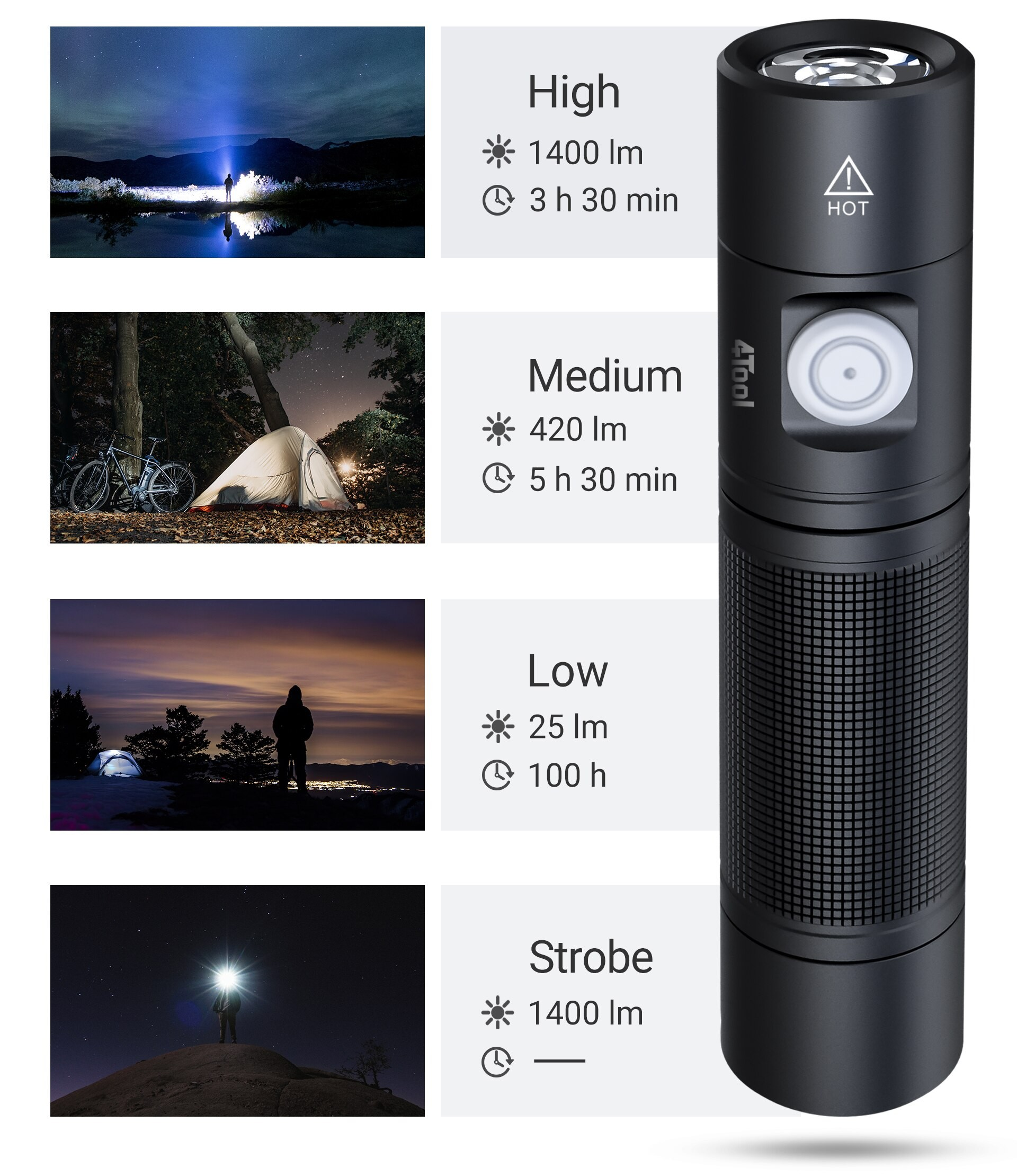 • 四個發光模式,高中低爆閃可調