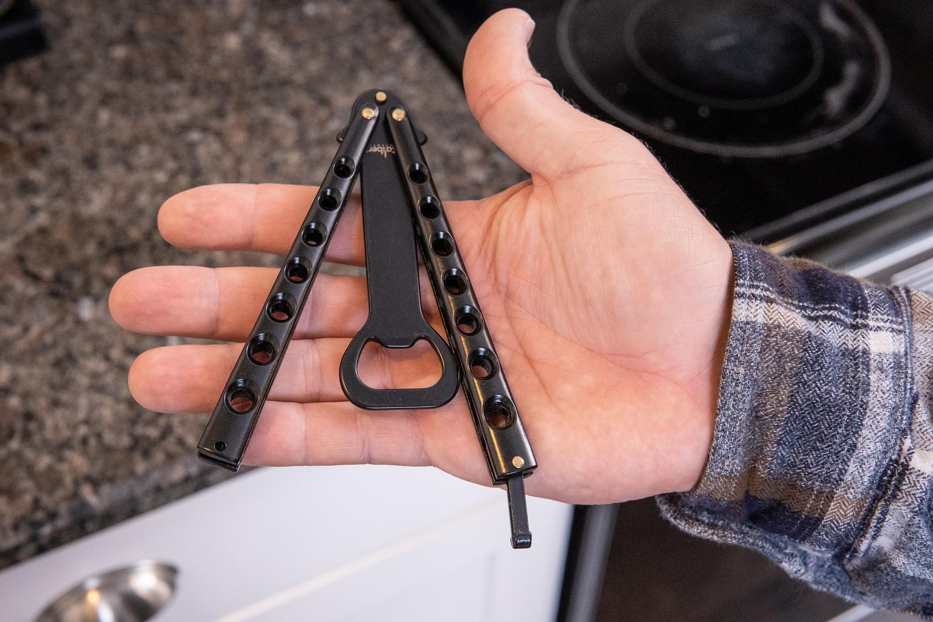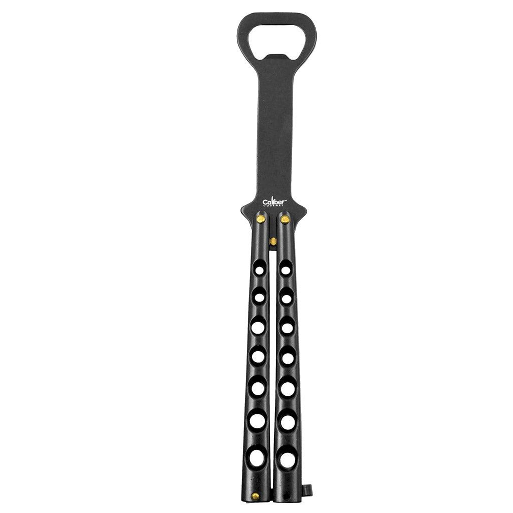Test, improve and develop your butterfly knife style flipping skills with your Caliber Gourmet™ Butterfly Knife style Bottle Opener! Designed to look and behave just like a butterfly knife but be safe like a bottle opener. Perfect for bartenders, knife enthusiast or if you just like to BBQ. Works for both screw type and pop top bottles. It also comes with a convenient latch for securing the blade in the open or closed position. So, Flip open your Caliber Gourmet™ Butterfly Style Bottle Opener and with the flick of your wrist, show off those butterfly flipping skills to entertain and impress your friends