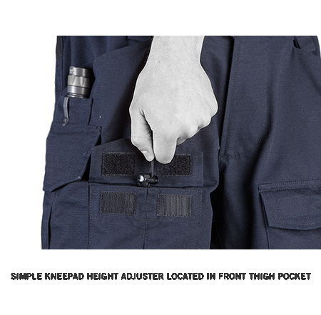 Simple kneepad height adjuster located in front thigh pocket
