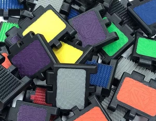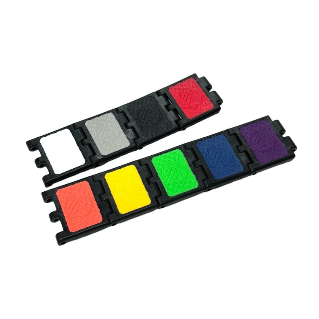 The Velcro hooks on the chain links are formed through an overmolding injection molding process, making them a permanent feature of each link