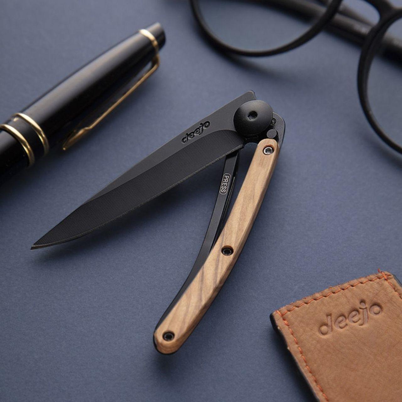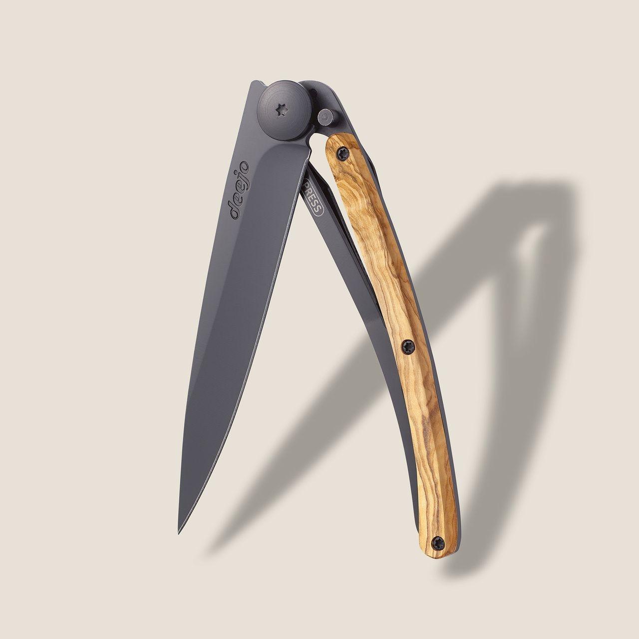 A light Deejo, ultralight, adorned in matte black reflections of titanium, illuminated here by the ochre warmth of the olive wood and the olive’s natural veins which never cease to enthral.