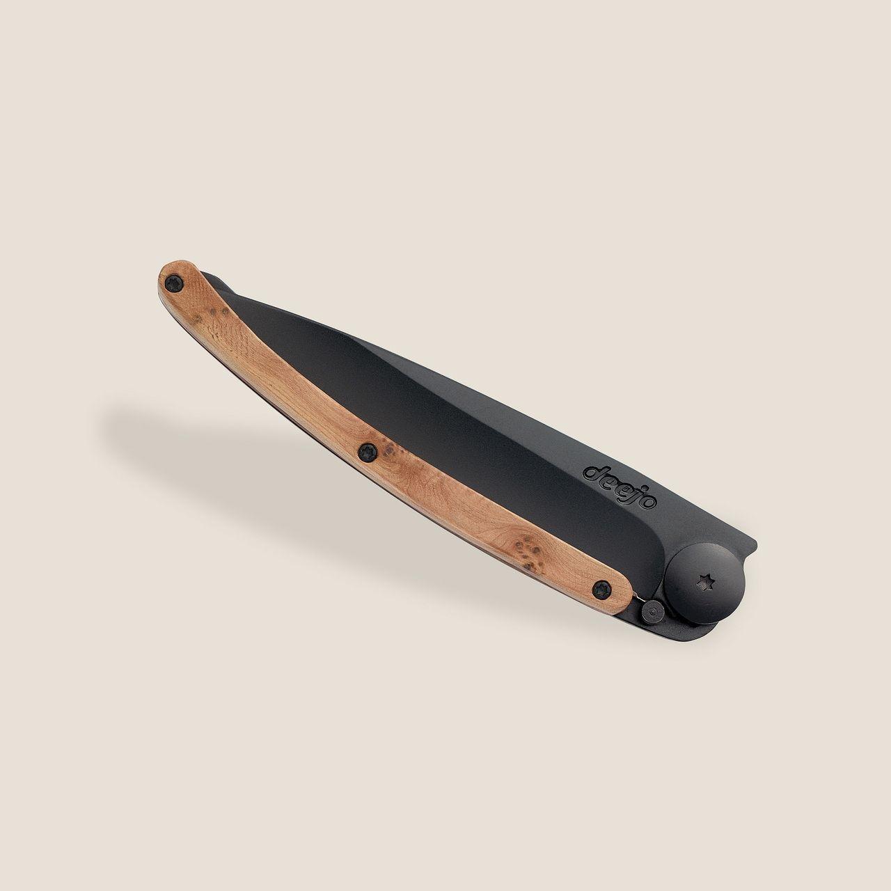 The most contrastive of the Deejo Black, distinct arabesques of juniper wood contrast definitively with the matte black of the titanium.